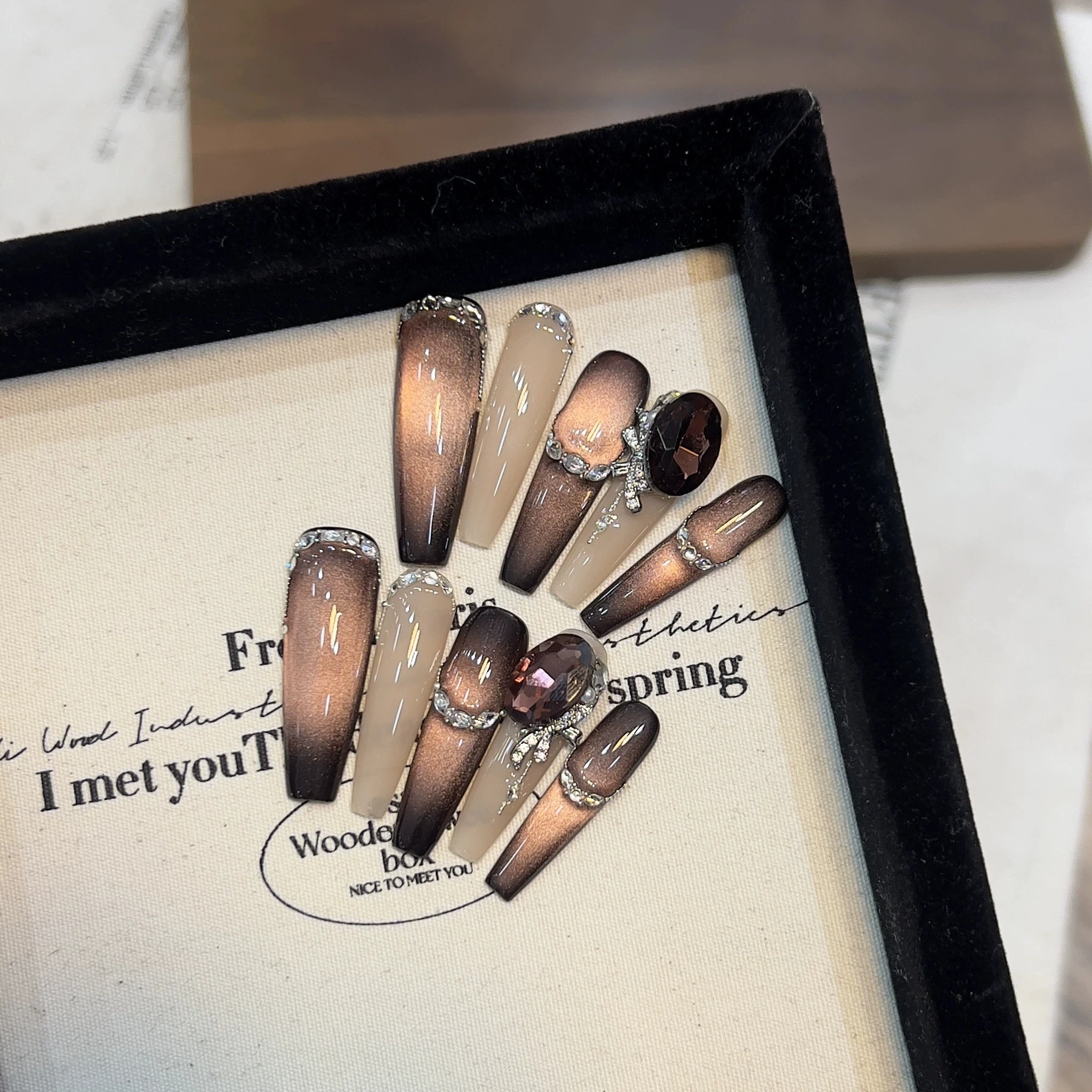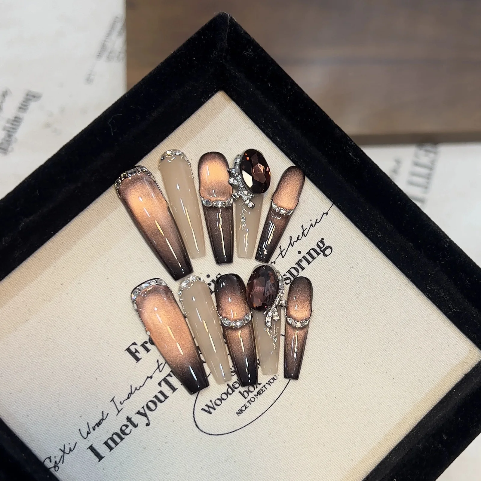 Long Handmade Press On Nails Brown Phototherapy Cat's Eye False Nails Removable Flash Zircon Fake Nails Diamond French Nail Art